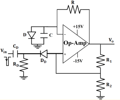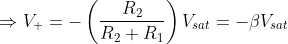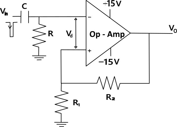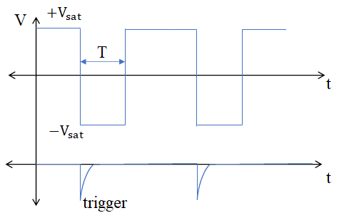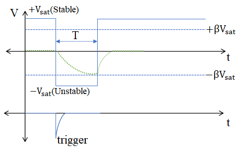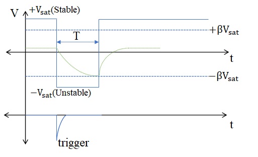 This kind of multivibrator is one in which one of the states is stable, but the other state is unstable (transient). A trigger pulse causes the circuit to enter an unstable state. After entering the unstable state, the circuit will return to the stable state after a set time. Such a circuit is useful for creating a timing period of fixed duration in response to some external event. The feedback from the output is fed to the non-inverting terminal. Hence, feedback is positive. Consider there are two saturation states